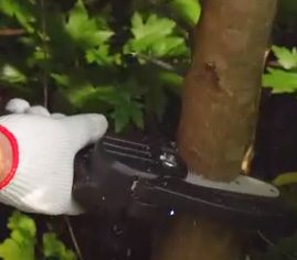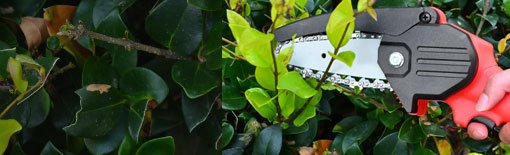 I trimmed down a few of my trees with this little saw and it works great. It’s small so I was able to get in a tight area for angle cuts. This saw is 36v and it felt stronger than my old set. There’s a protective cover on the back that prevents debris from flinging out.